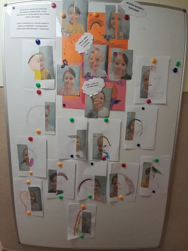 W zwiazku z tym w grupach odbyły się ZAJĘCIA pt. „Taki jestem”- polegające na wykonaniu plakatów; pozwalające dostrzec podobieństwa i różnice między sobą a kolegami i koleżankami; uczące określania własnych mocnych i słabszych stron, uświadamiające dzieciom, że różnorodność jest ciekawa, dobra i potrzebna.