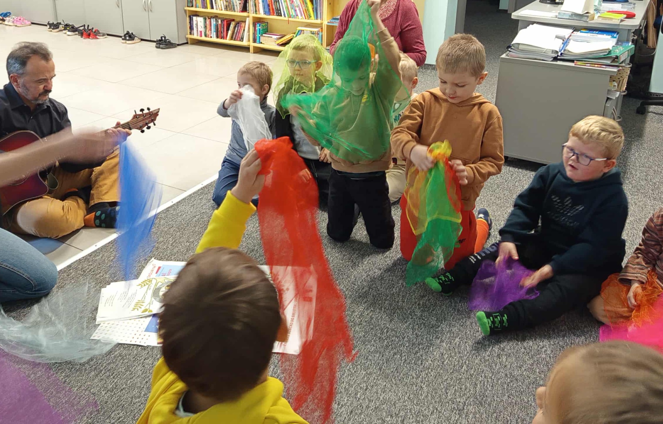 Dzieci poznały historię Krasnala w krzywej czapce, który miał mnóstwo przygód, a potem nauczyły się piosenki o sowach — mądrych i czujnych strażniczkach książkowych opowieści.